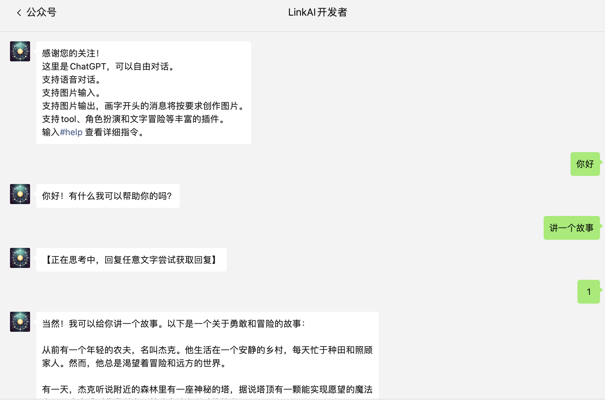 由于受订阅号限制,回复内容较短的情况下(15s 内),可以立即完成回复,但耗时较长的回复则会先回复一句 “正在思考中”,后续需要用户输入任意文字主动获取答案,而服务号则可以通过客服接口解决这一问题。