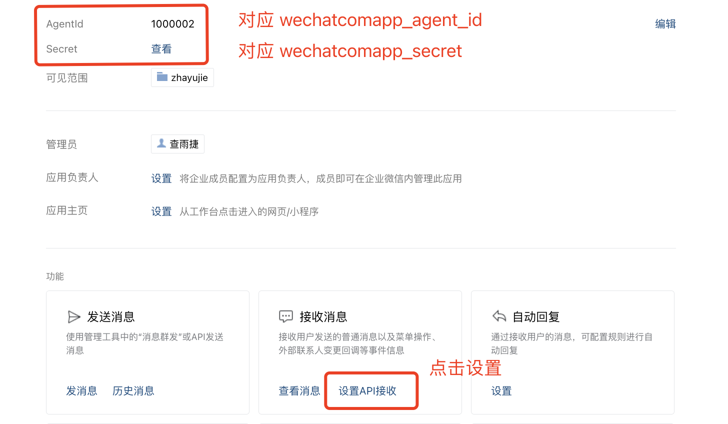 在config.json 中添加以下配置(各参数与企业微信后台的对应关系见上方截图):