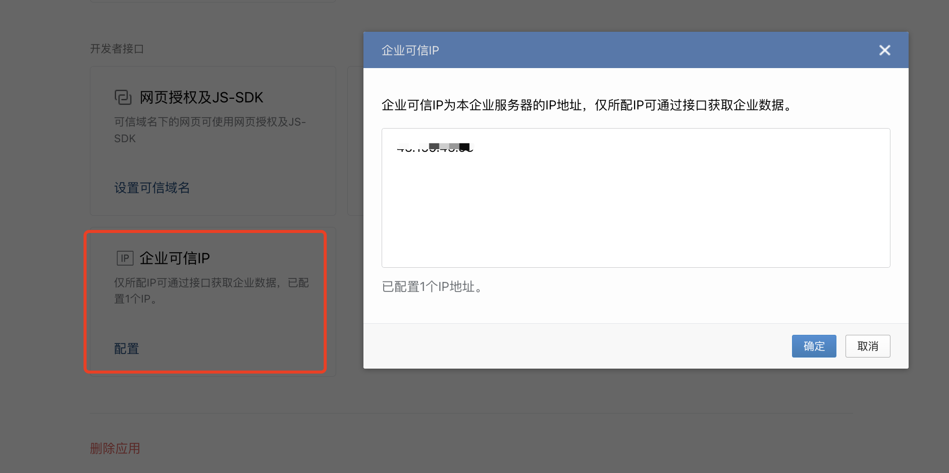 程序启动后,回到企业微信后台保存 消息服务器配置,保存成功后还需将服务器 IP 添加到 企业可信IP 中,否则无法收发消息:
