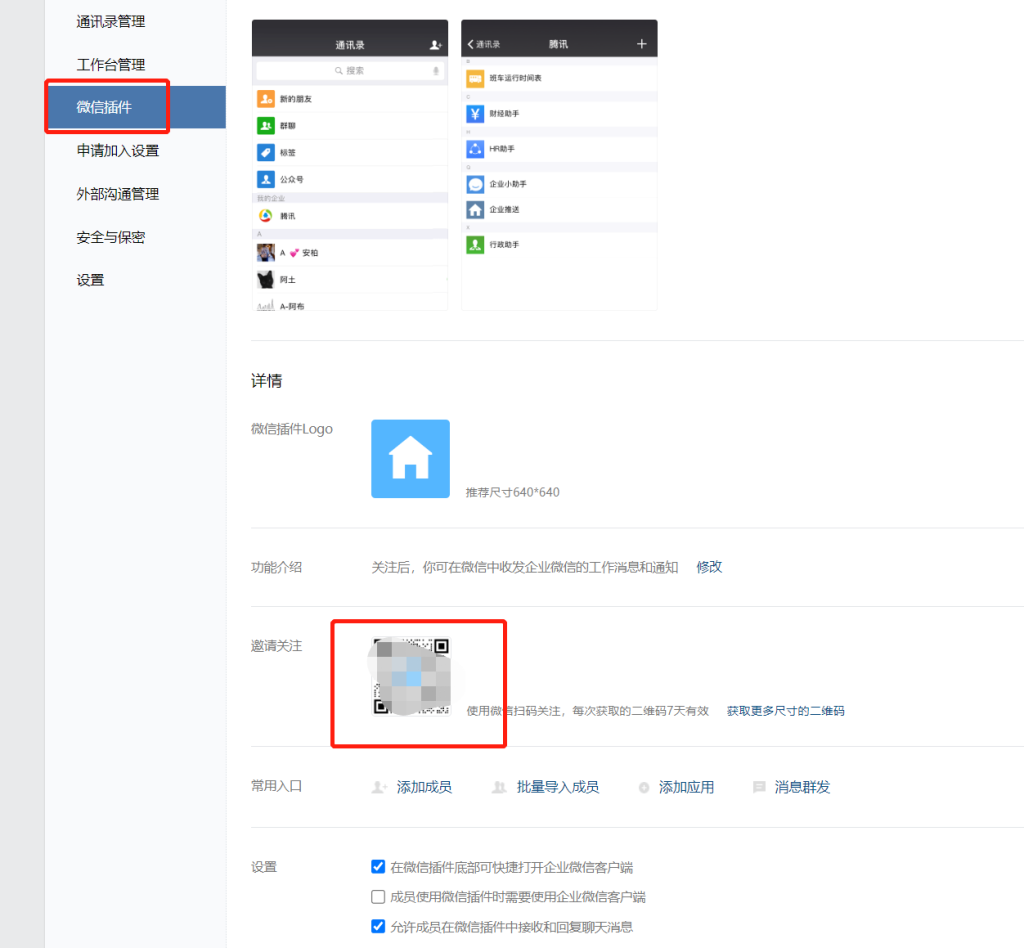 如需让外部个人微信用户使用,可在 我的企业 → 微信插件 中分享邀请关注二维码,个人微信扫码关注后即可与应用对话: