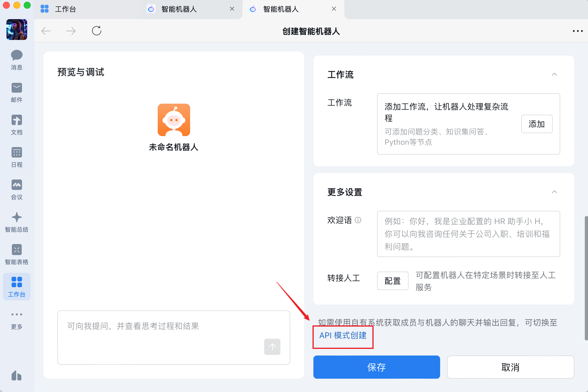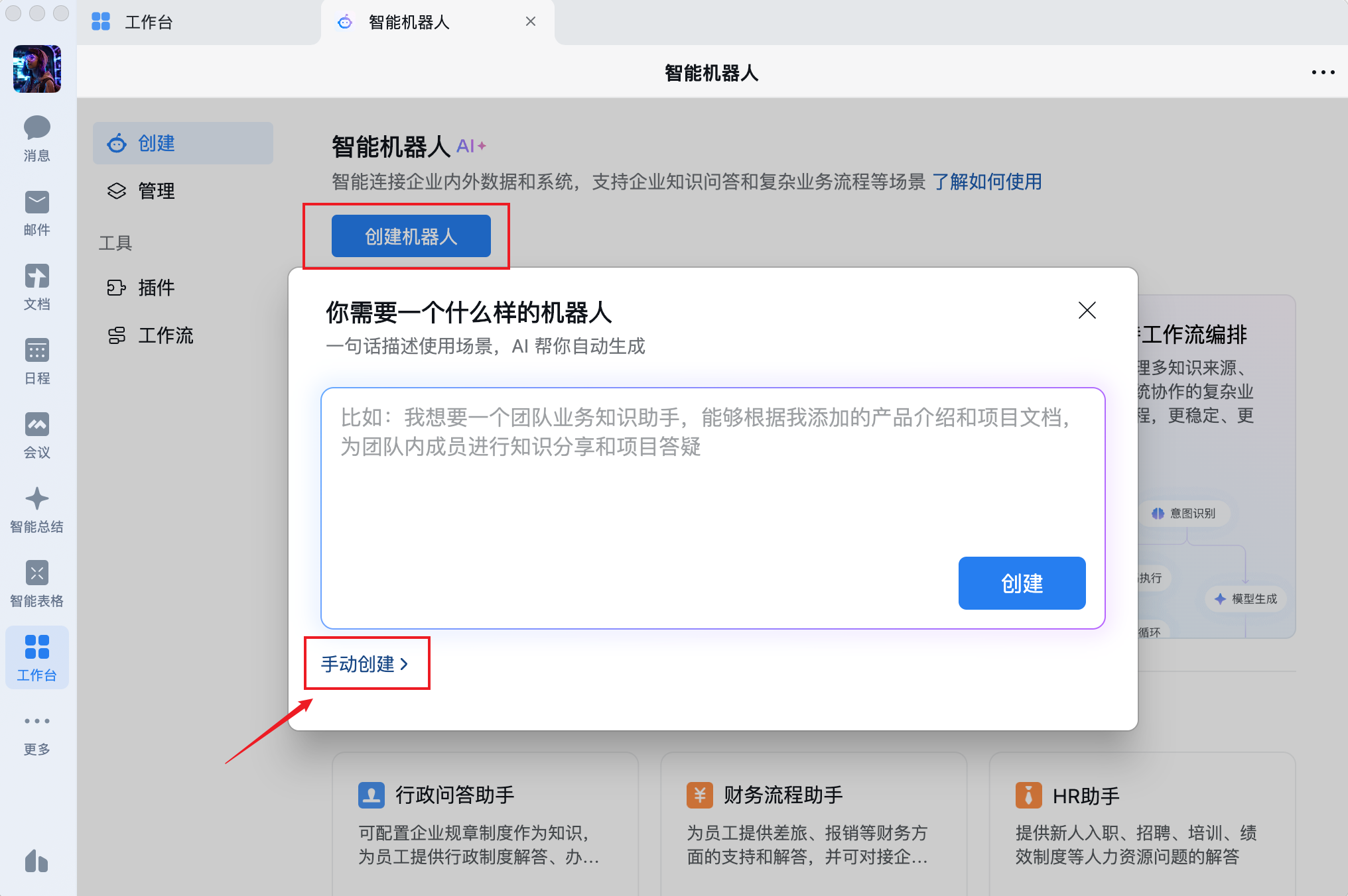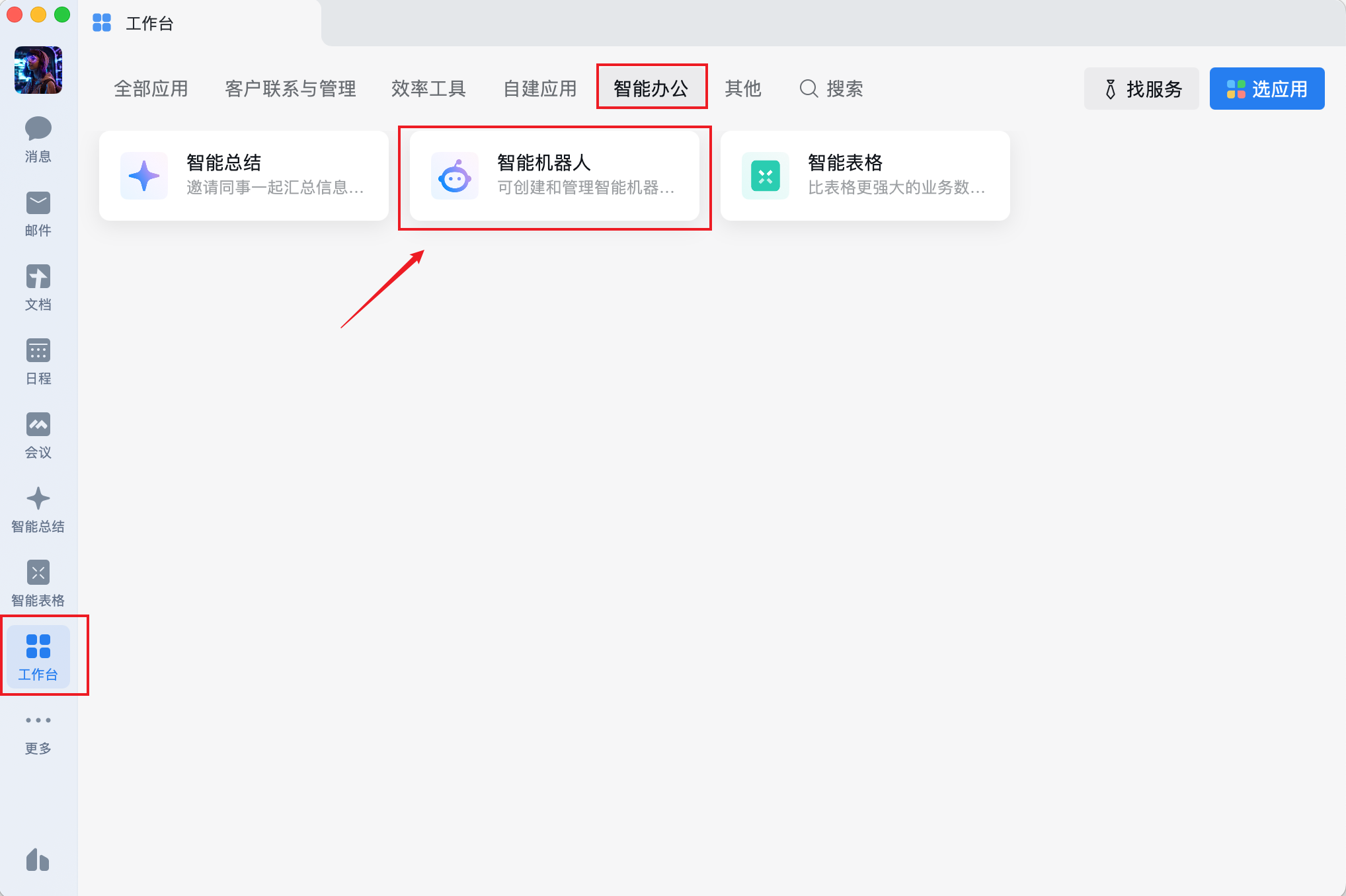 - 打开企业微信客户端,进入工作台,点击智能机器人: