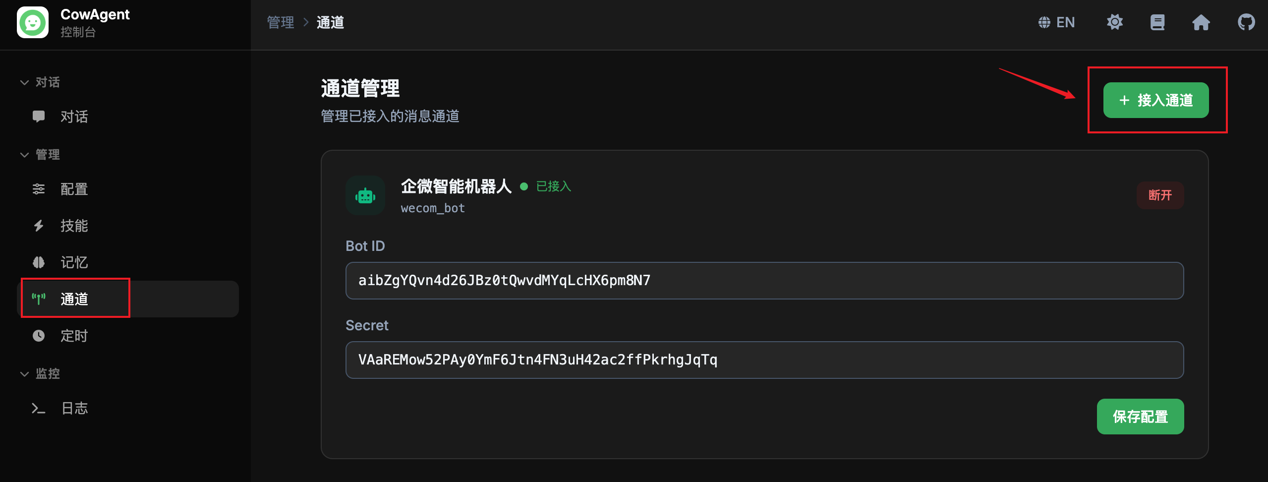 启动程序后打开 Web 控制台 (本地连接为: http://127.0.0.1:9899/ ),选择 通道 菜单,点击 接入通道,选择 企微智能机器人,填写上一步保存的 Bot ID 和 Secret,点击接入即可。