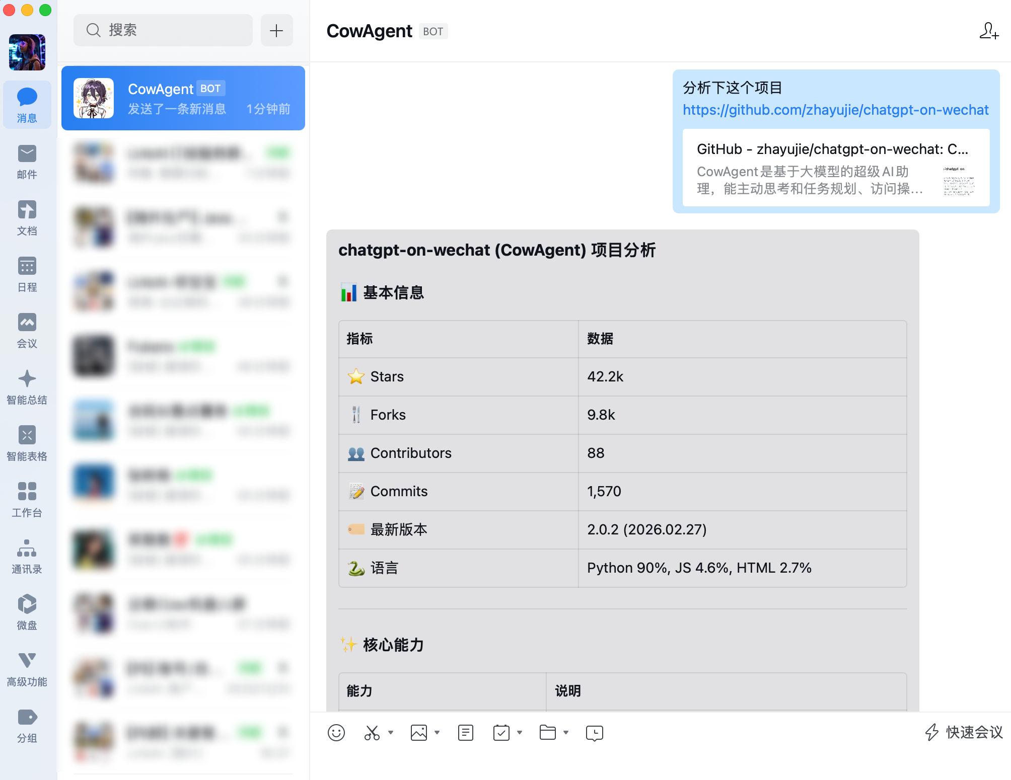 通过企业微信智能机器人接入CowAgent,支持企业内部单聊和内部群聊,无需公网 IP,使用 WebSocket 长连接模式,支持Markdown渲染和流式输出。