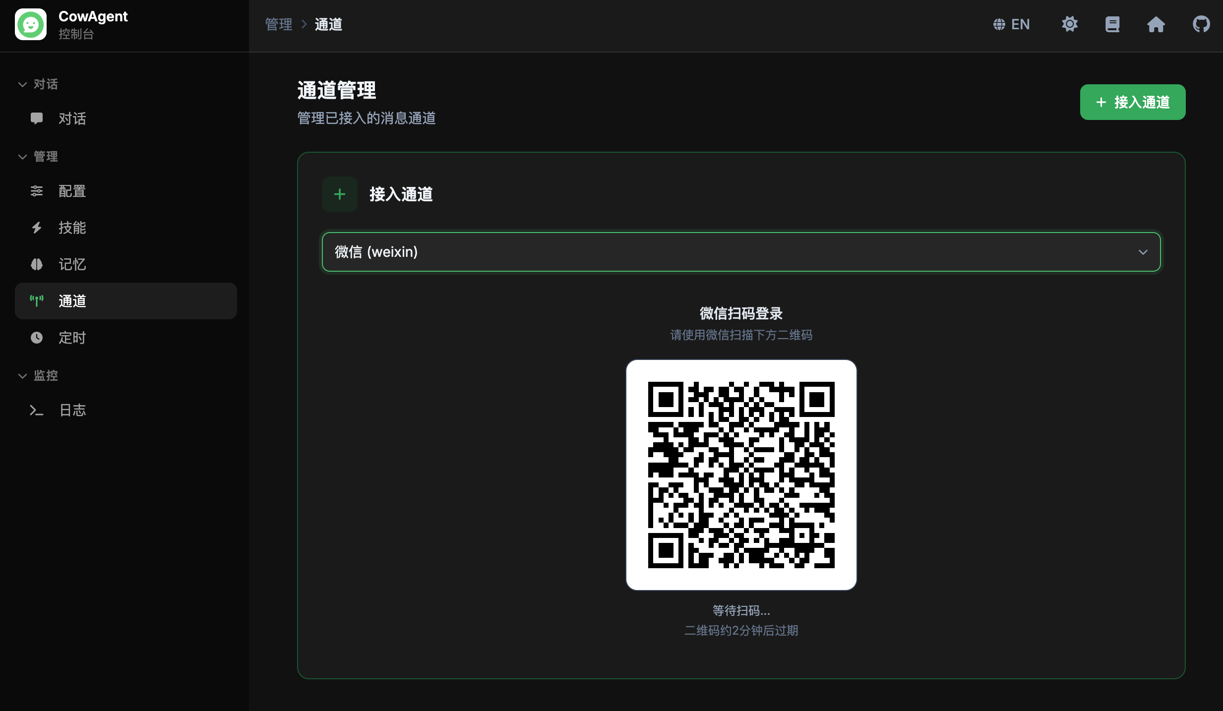 启动 Cow 项目后打开 Web 控制台 (本地链接为: http://127.0.0.1:9899/ ),选择 通道 菜单,点击 接入通道,选择 微信,点击接入后按照提示扫码登录。