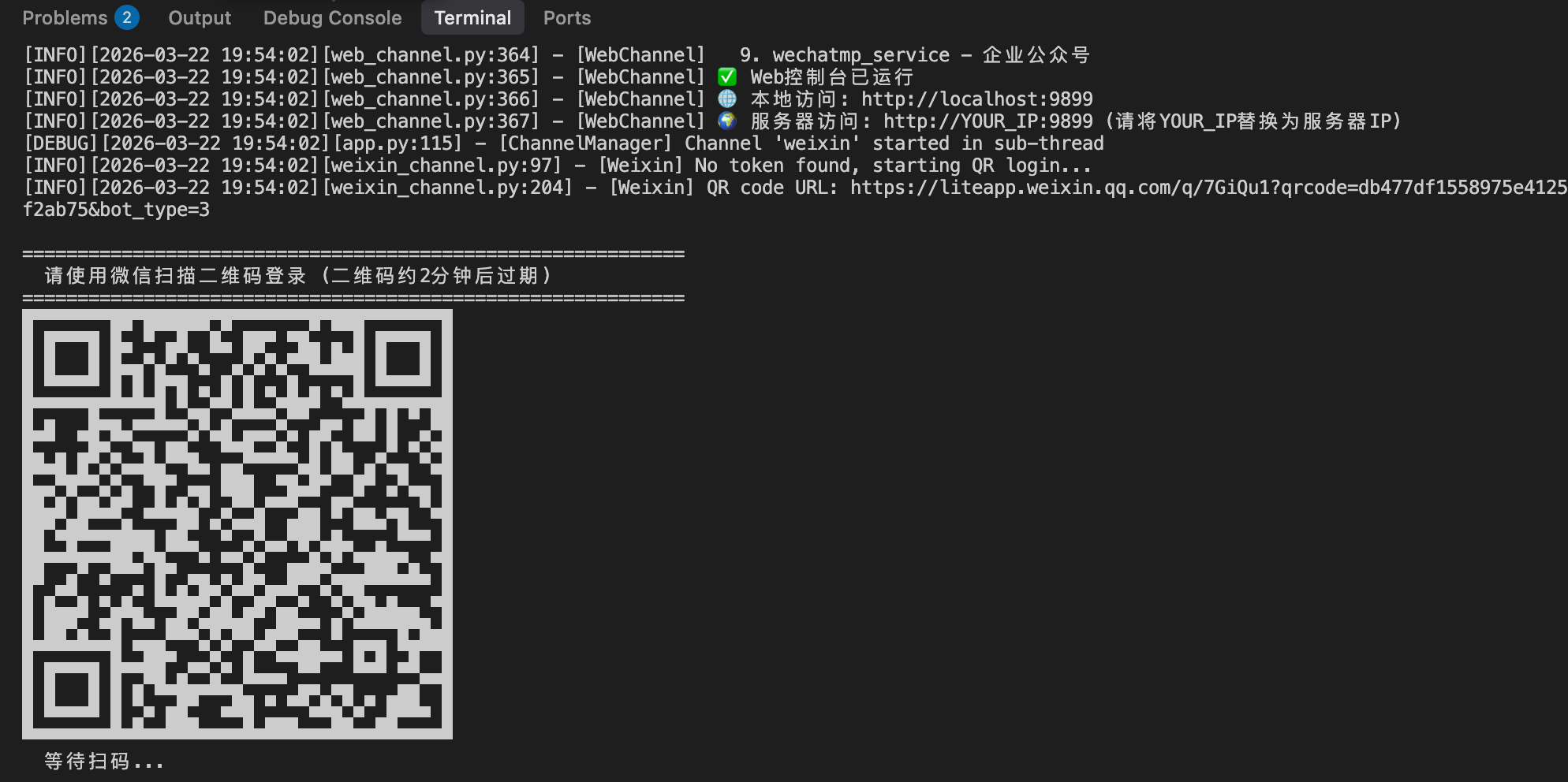 首次启动时,终端会显示一个二维码(有效期约 2 分钟)。使用微信扫描二维码并在手机上确认后即可完成登录。- 二维码过期后会自动刷新并重新显示