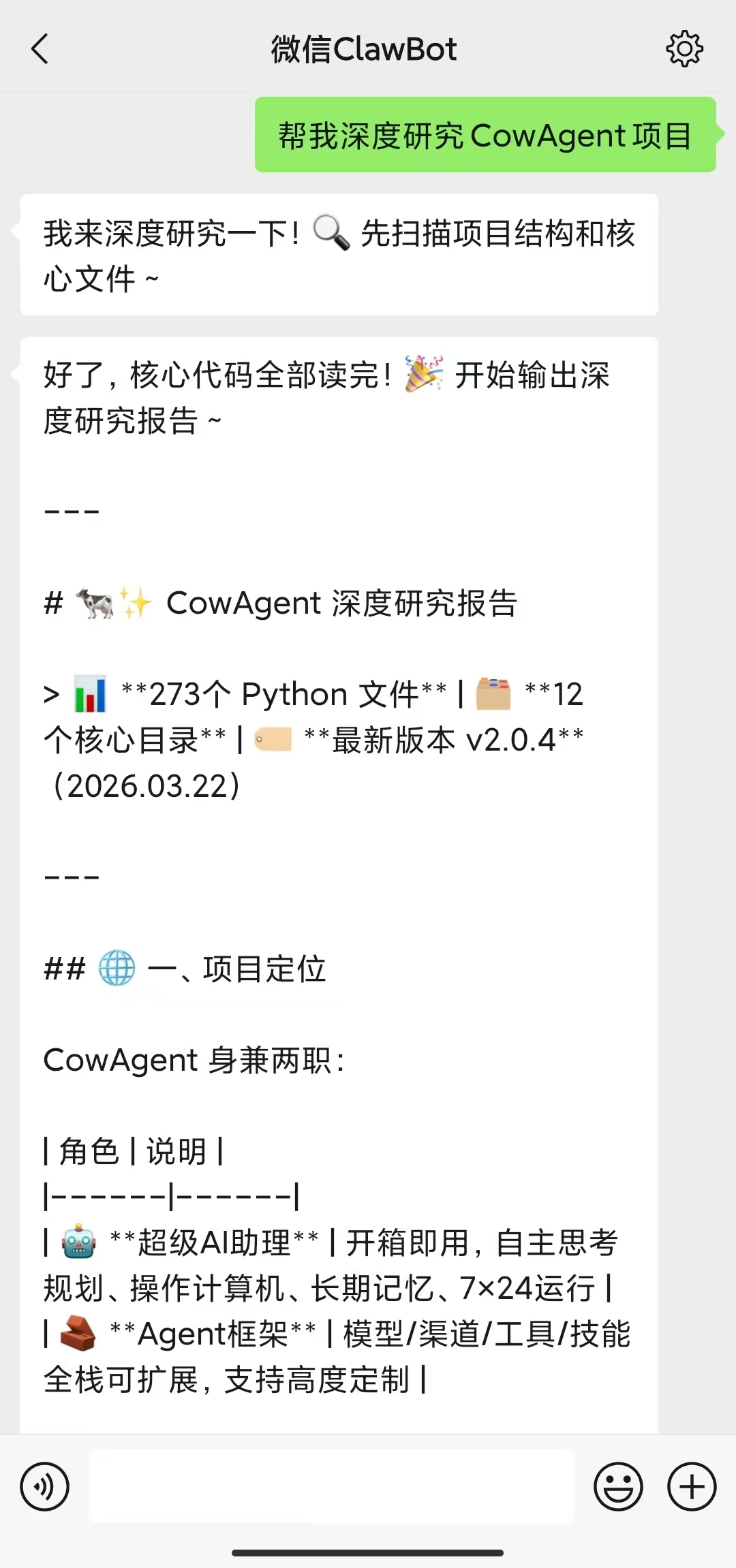 微信扫码并进行授权确认后,即可完成接入并开始对话。接入微信后会在对话中创建出一个机器人助理,不会对已有账号的正常使用有任何影响。你可以通过搜索”微信ClawBot”随时找到这个机器人,还可以修改这个机器人的头像、备注等信息,将机器人置顶在消息列表等。