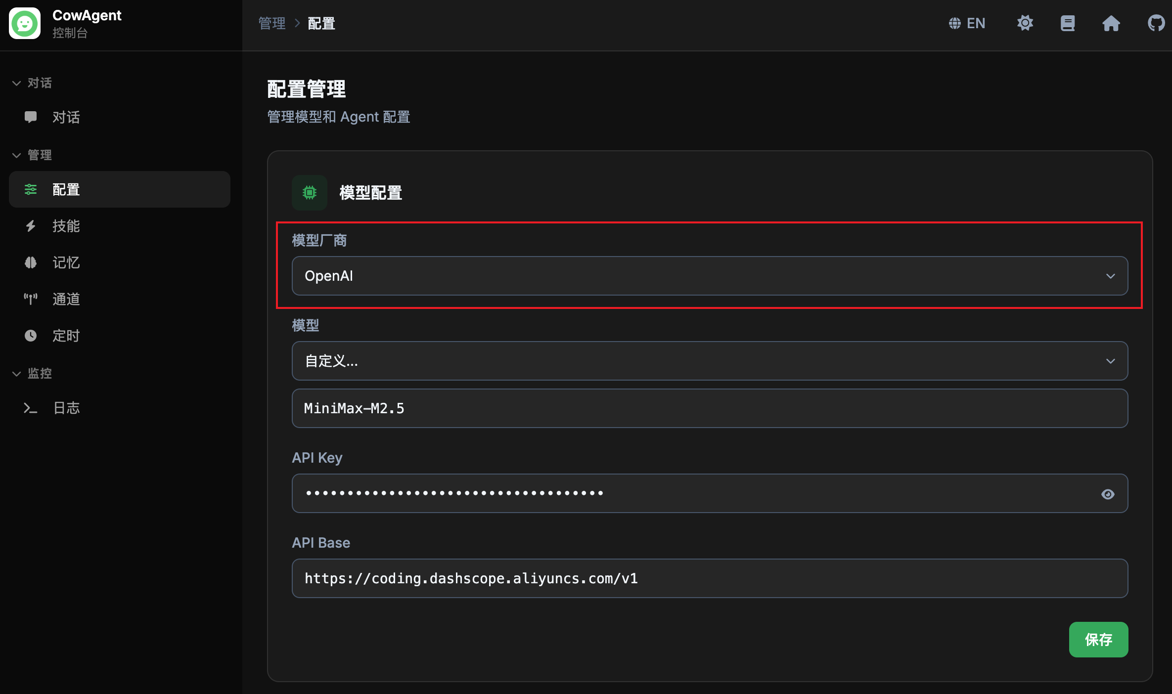 All providers can be accessed via the OpenAI-compatible protocol, and can be quickly configured through the web console. Set the model provider to OpenAI, select a custom model and enter the model code, then fill in the corresponding provider’s API Base and API Key: