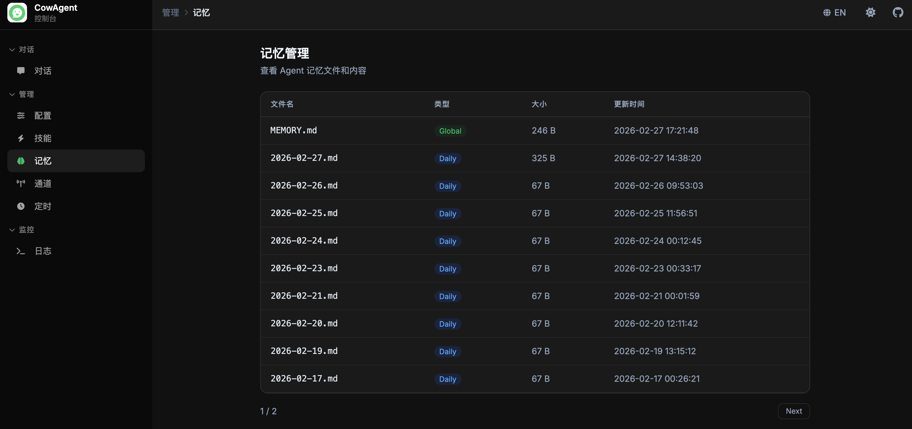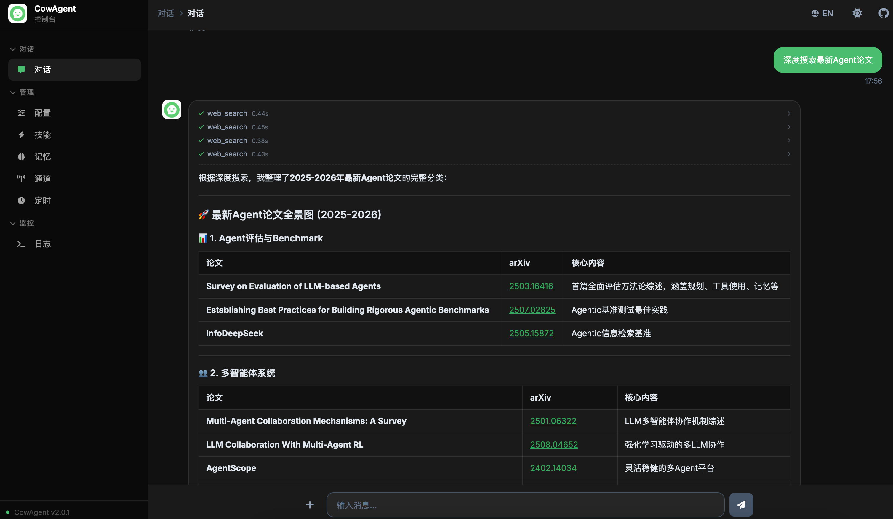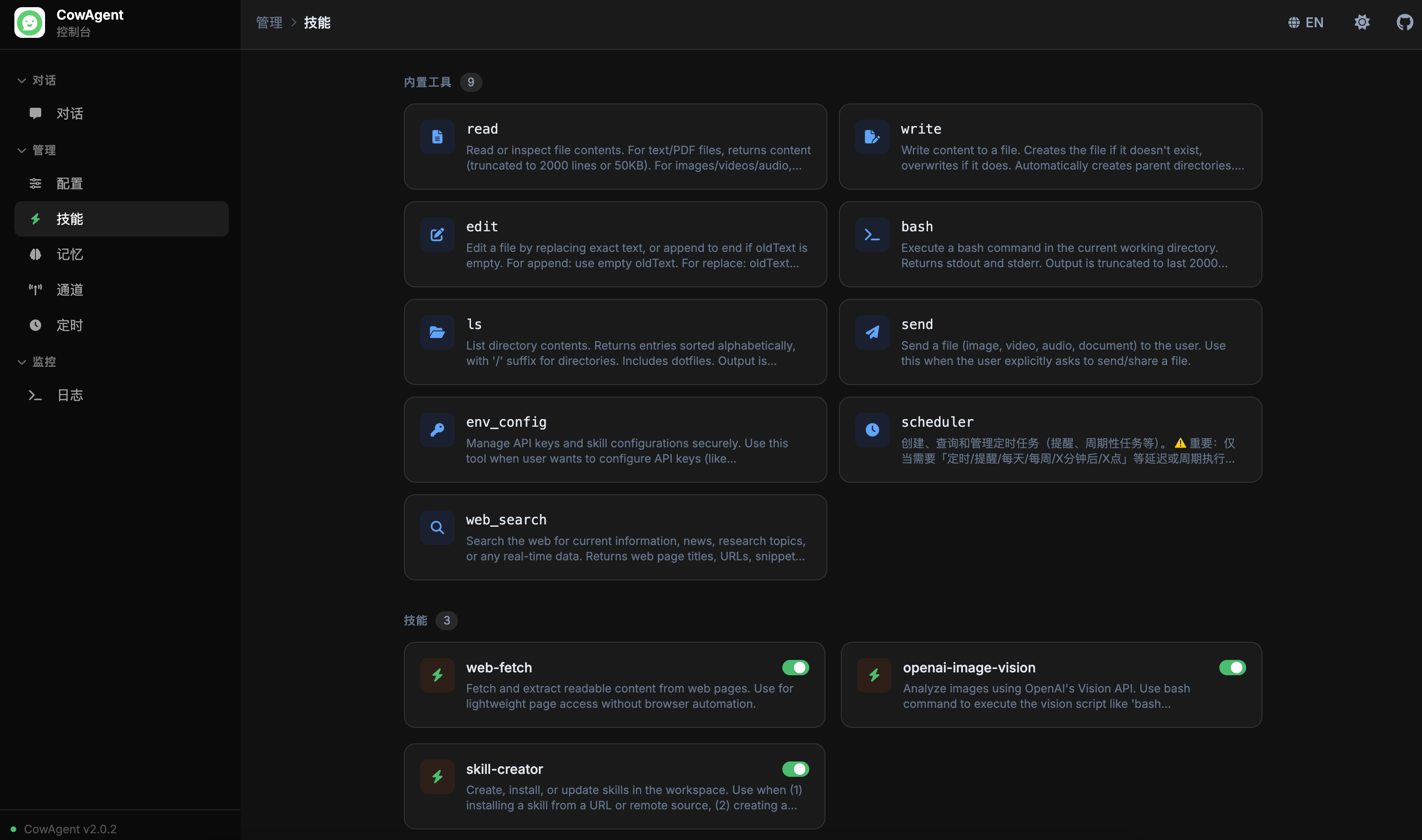 本次对 Web 控制台进行了全面升级,支持流式对话输出、工具执行过程和思考过程的可视化展示,并支持对模型、技能、记忆、通道、Agent 配置的在线查看和管理。对话界面