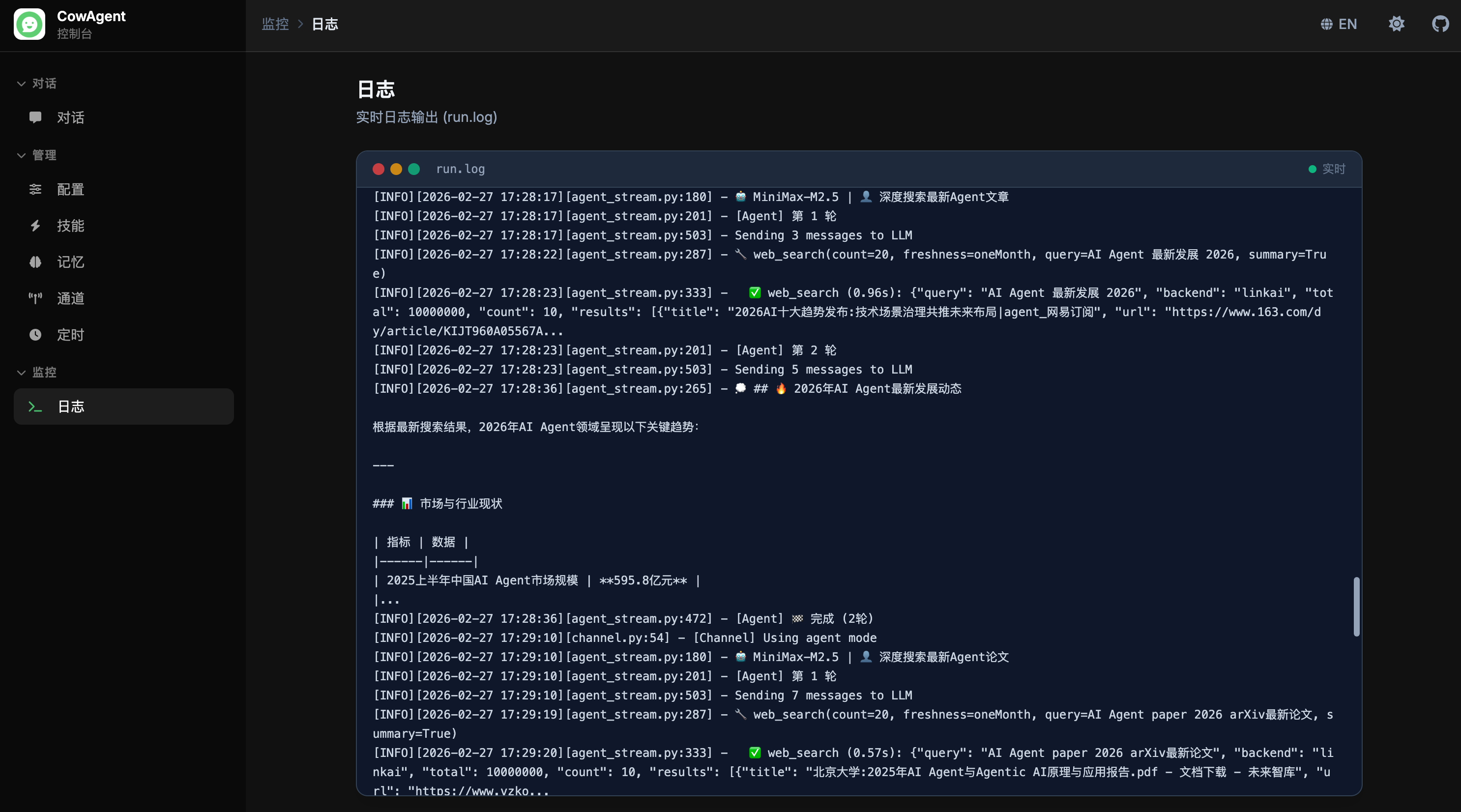 支持在线实时查看 Agent 运行日志,便于监控运行状态和排查问题: