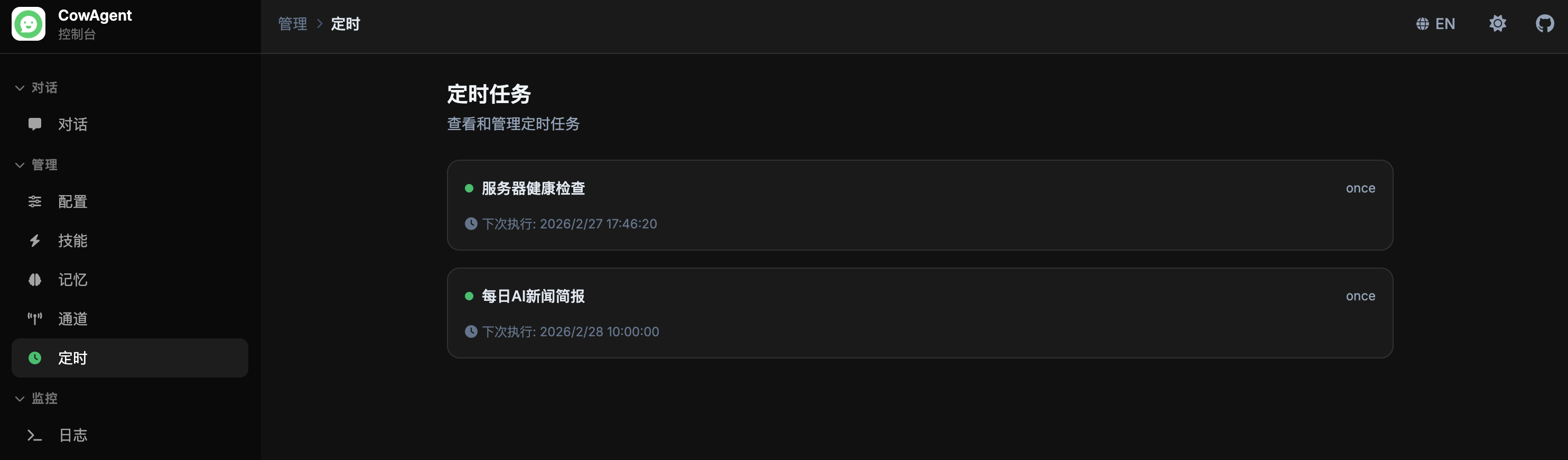 支持在线查看和管理定时任务,包括一次性任务、固定间隔、Cron 表达式等多种调度方式的可视化管理:
